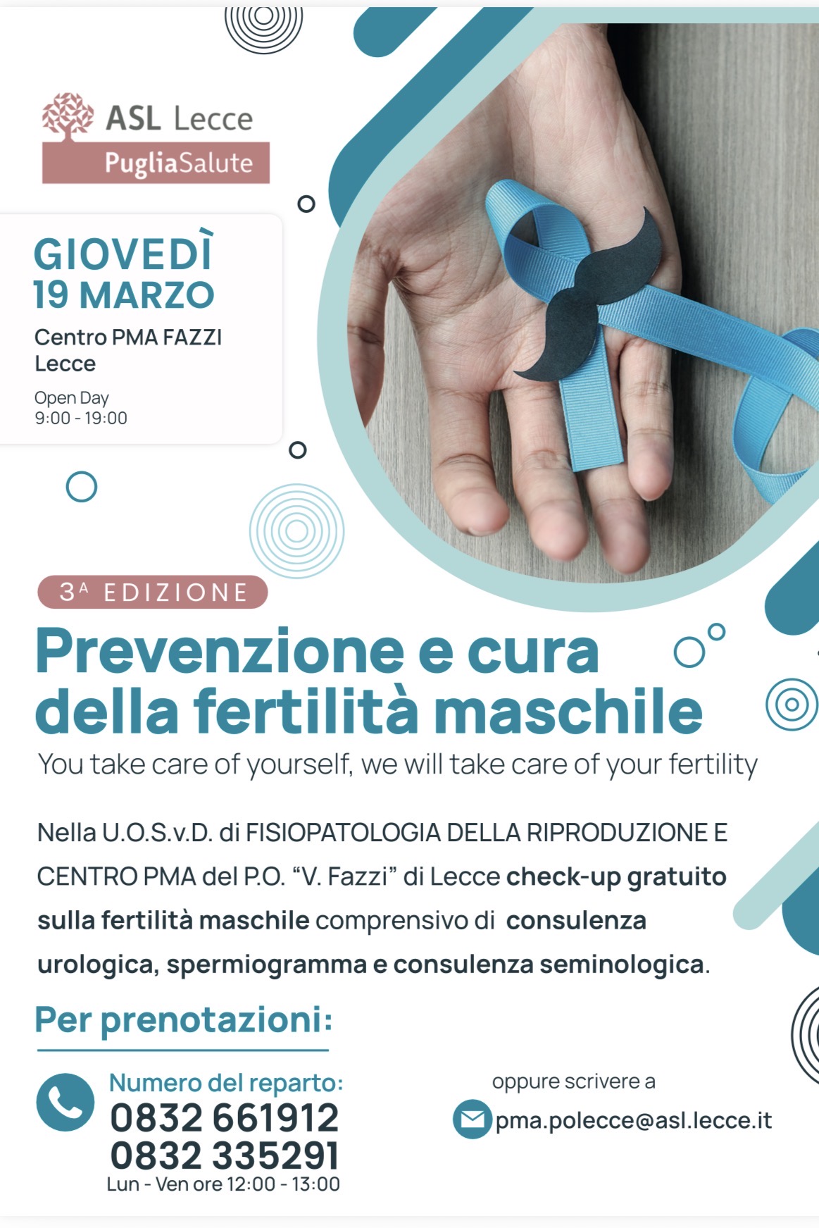 L’U.O.S.V.D. di Fisiopatologia della Riproduzione e Centro PMA del Vito Fazzi di Lecce (piano terra) sarà aperta agli uomini maggiorenni, dalle ore 9 alle ore 19, per un check up gratuito sulla fertilità maschile, comprensivo di consulenza urologica, spermiogramma (per lo spermiogramma, la raccolta sarà effettuata nel Centro PMA ma è necessario mantenere un’astinenza sessuale nei 3 giorni precedenti) e consulenza seminologica.